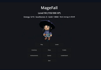 MageFall is a 3D arena survivor. You drop into a forest map, swarmed by skeleton waves and a final boss at wave 20. Movement is joystick/WASD, attacks are auto-cast. Every level-up offers upgrades: damage, attack speed, multishot with homing, arcane aura, shield orbs, pickup radius, XP rate. Powerups (magnet, bomb, heal) help you vacuum orbs, nuke crowds, or recover HP. Gold and XP flow from kills; account stats (energy, soul stones, kills, total XP, waves, gold, deaths) persist and show in the menu leaderboard. The loop is short and punchy—farm, upgrade, survive—reinforced by visual feedback (damage flashes, “Level Up!” toasts, floating damage numbers) and a per-run energy cost to pace sessions.